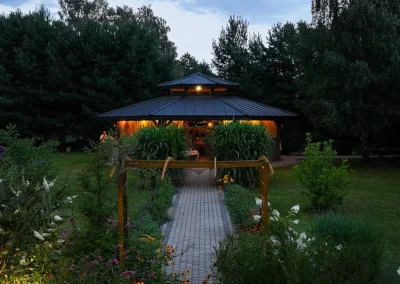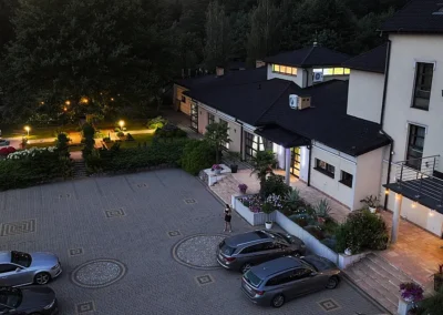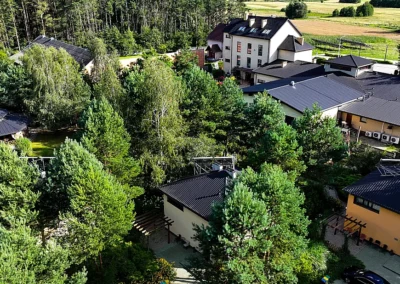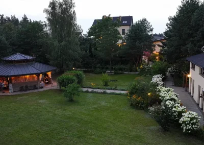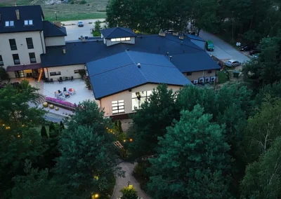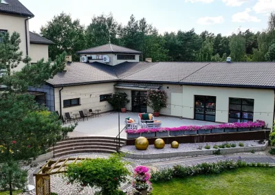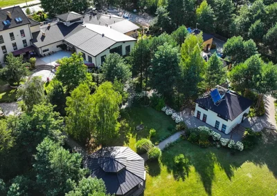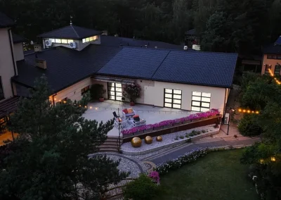 1.5 hektara zieleni, przestronny taras, ceremonia plenerowa o zachodzie słońca i nasza bryła budynku w pełnej krasie. Odkryj wizualny potencjał naszego otoczenia.