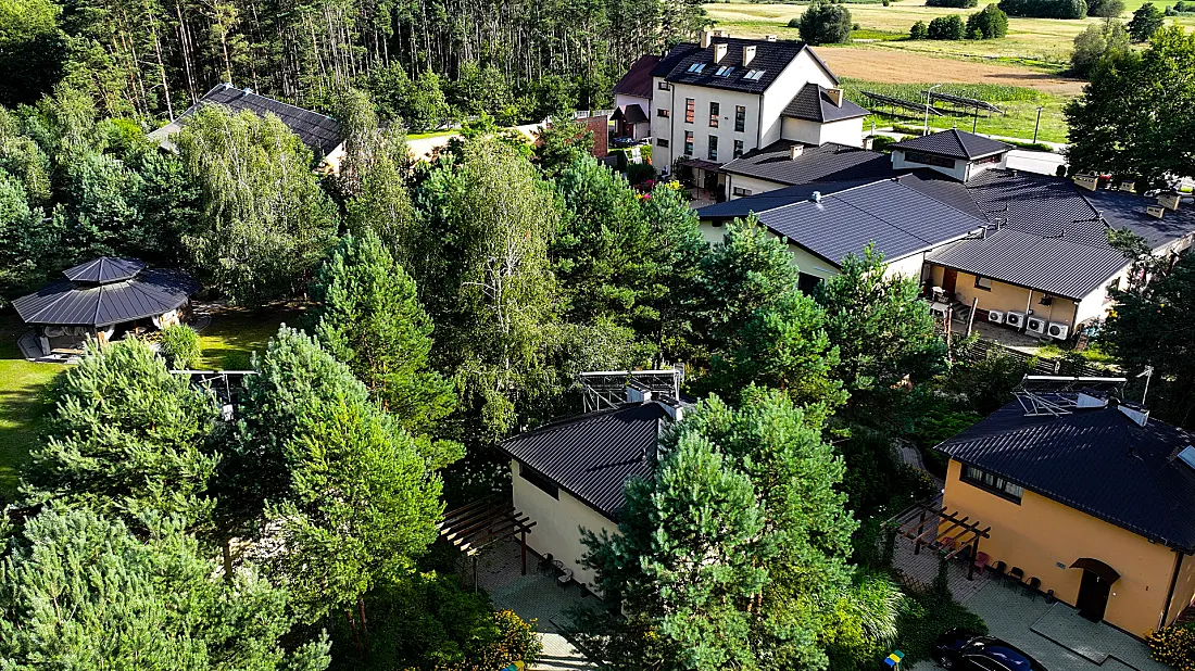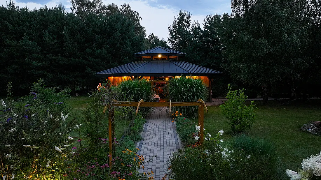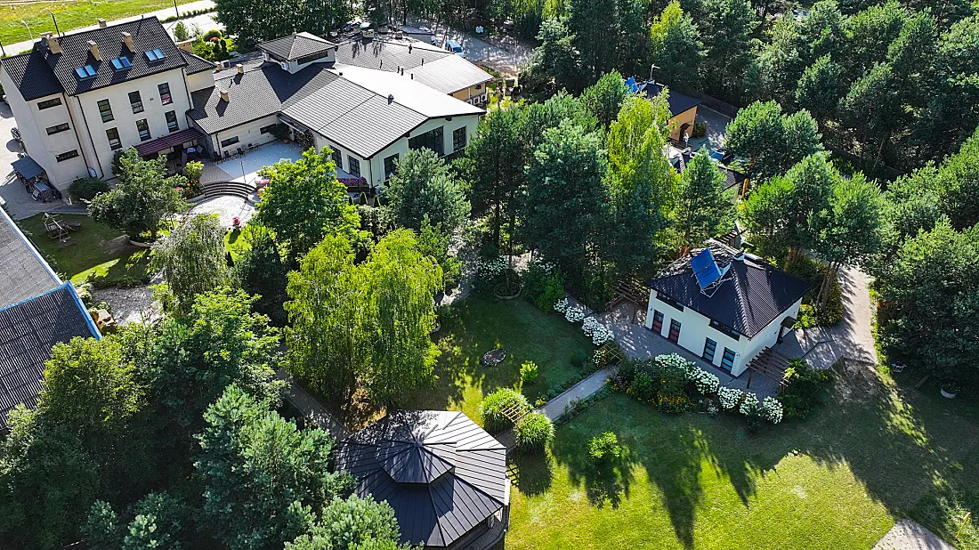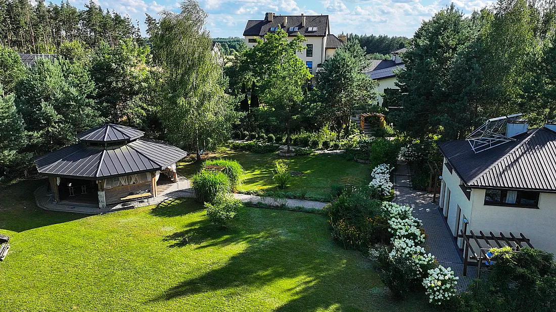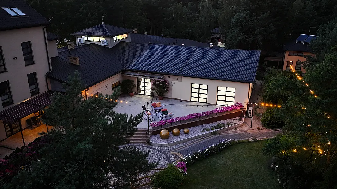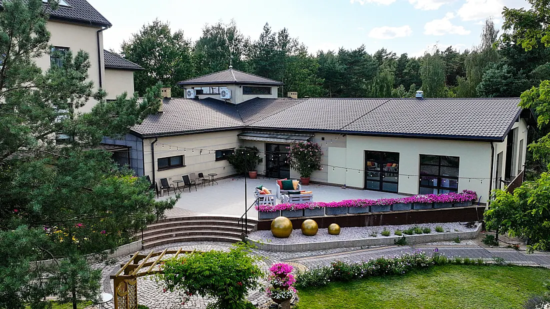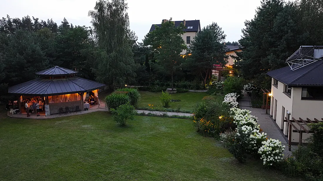 1.5 hektara zieleni, przestronny taras, ceremonia plenerowa o zachodzie słońca i nasza bryła budynku w pełnej krasie. Odkryj wizualny potencjał naszego otoczenia.